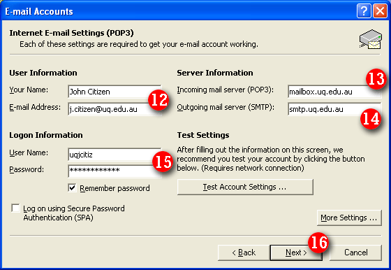 | 12)Enter your name and e-mail address. (Note: the name you enter here will be displayed on all outgoing email messages). | ||||