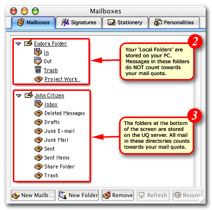 3)The folders at the bottom-left contain all your server-based mail. Messages in these folders contribute to your mail quota. As you have a fixed amount of space on the server it is important to monitor the amount of mail in these directories to ensure your account does not go.'Over Quota'. A go.d rule of thumb is to move any messages that are more than a month old to your local folders group. For assistance transferring mail please read below.
