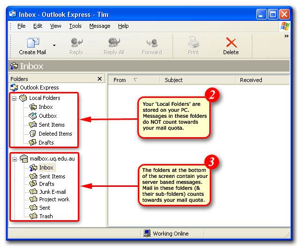 2)Examine the folder list on the left of the screen. Your 'Local Folders' are displayed at the top of the window, and as their name would suggest, are stored locally on your PC. Messages in your local folders do NOT count towards your mail quota.