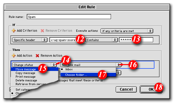 For example, if you wanted to consider anything with a score of 3 or more to be spam, the rule would look like: 'X-SpamDetect: ***'. Decreasing the number of asterisks will result in classifying more e-mails as spam. You may need to check your spam folder more carefully for non-spam e-mails that might have been classified as spam. If you wanted to rate anything with a score of 8 or greater as spam, the rule would look like: 'X-SpamDetect: ********'. Increasing the number of asterisks may result in fewer filtered e-mails being classified as spam and more potential spam staying in your Inbox.